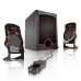 Елегантна модель з чудовим відтворенням звуку. Оригінальний дизайн сабвуфера та сателітів. Управління за допомогою провідного пульта дистанційного керування. Вхід 3,5 мм стерео для підключення другого джерела звуку та вихід 3,5 мм стерео для підключення навушників.